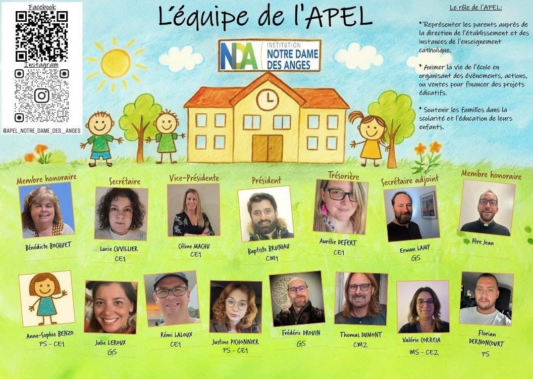L'APEL présente sa nouvelle équipe pour l'année scolaire, composée de membres dynamiques et motivés, engagés pour le bien-être des élèves. les parents intéressés sont invités à rejoindre l'équipe, leur participation étant considérée précieuse.