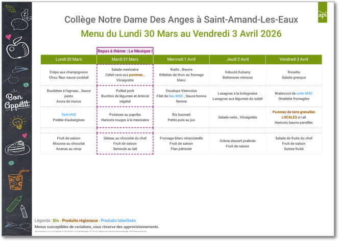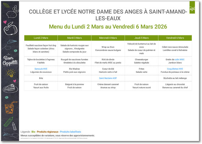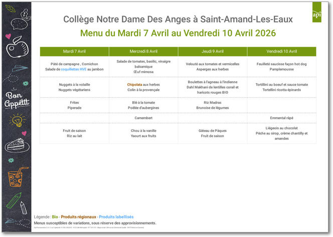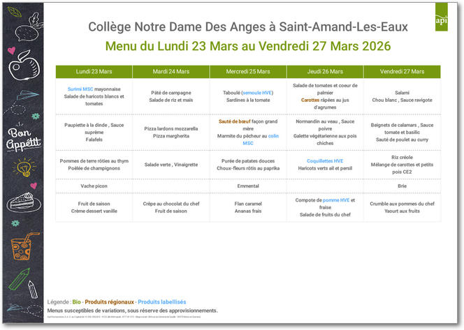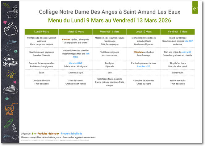 Cuisiner avec passion des produits frais en privilégiant l'ancrage territorial. Pleinement conscients de l'impact de nos achats sur la préservation de l'environnement, nous construisons un réseau régional de producteurs pour assurer un approvisionnement privilégiant les produits bio, frais, de saison et locaux. Voici les menus pour les mois à venir : |